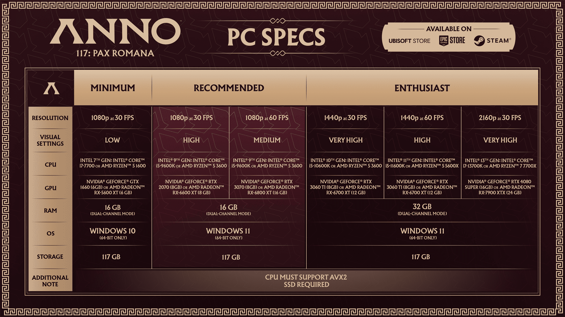 Alongside the demo, Ubisoft also revealed the PC requirements for Anno 117: Pax Romana. The specs range from the minimum needed to run the game to the highest setting, which the team is calling “Enthusiast.”