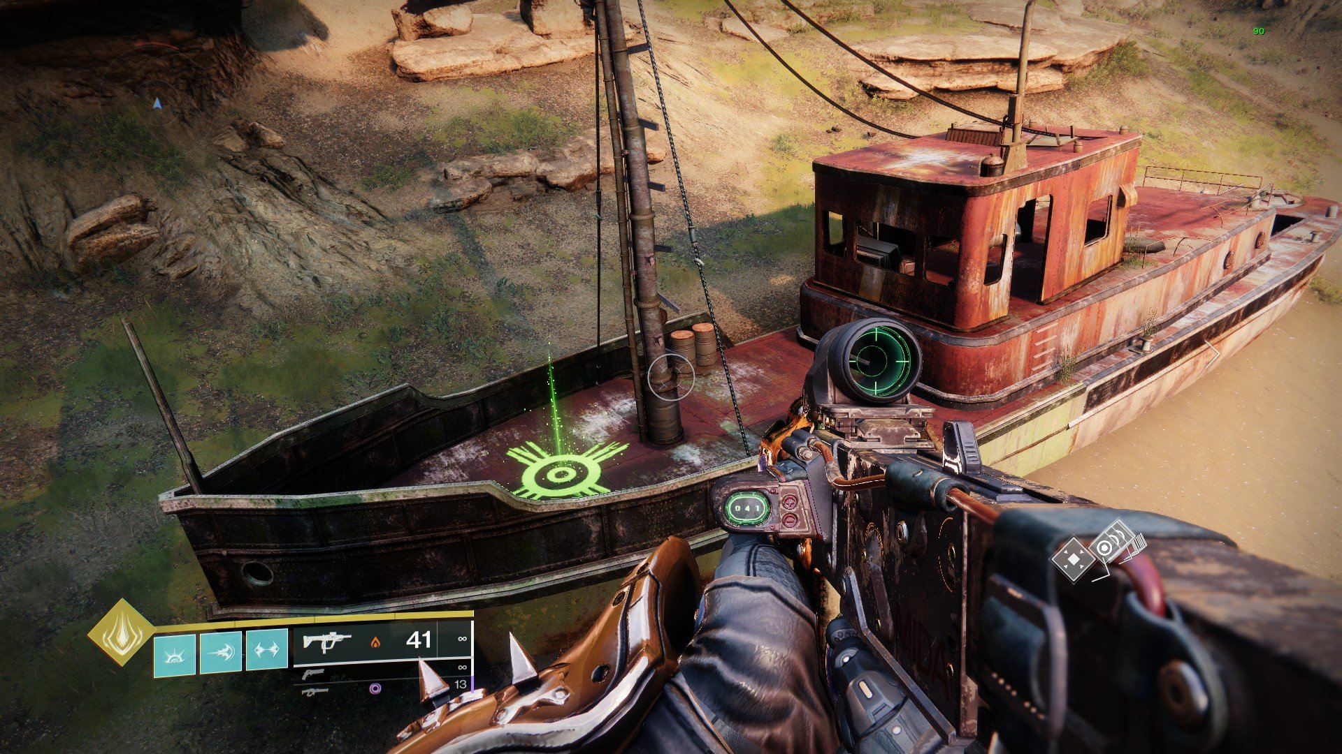 In this step, you are again in search of the green Fallen Symbol on the ground. This hunt will require you to head to the Cosmodrome in the Forgotten Shore. Head to the area with the rusted boats left ashore. One of them is pointing at the water and in front of its mast is the green Fallen Symbol (pictured above). Interact with it to complete this step.