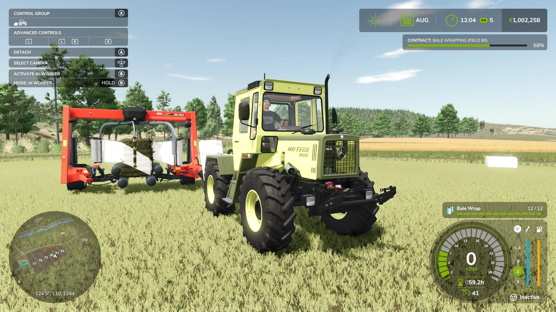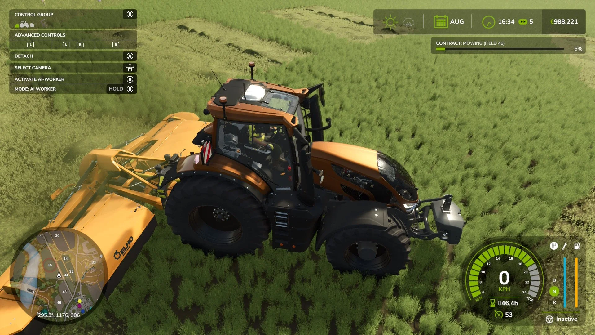 Starting with Easy mode gave me a chance to experiment with the various vehicles and tasks by leasing equipment on a job-by-job basis. If any particular job gets boring, you can hire an AI worker to finish it for you and move on to the next task. I’d often start something, let an AI worker take over, and then move on to the next task by swapping to a different vehicle with a press of a button, which made for a satisfying loop that kept the experience from growing stale. Whether you’re selling your harvested crops, grabbing feed for your animals, or else accomplishing various tasks around the town, there’s never a dull moment and you can fill each day with a myriad of tasks. In one day, I was able to harvest and sell an entire plot of land, treat an adjacent one with lime, send an AI worker off to accomplish a large-scale mowing job with rented equipment, and start a rock-breaking job all in the same day. You can even work at night, though visibility is poor even with your lights on. And thankfully, there are several radio stations that you can cycle through while in a vehicle.