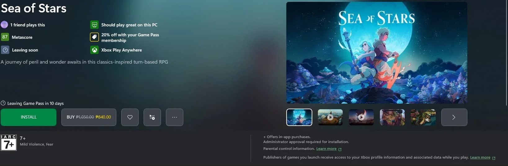 Sea of Stars is a fantastic RPG that is greatly inspired by classic turn-based RPGs and features a retro overhead visual style and a reactive combat system that, in some ways, is similar to Clair Obscure: Expedition 33. If you love classic RPGs, this is a modern title that breathes the essence of what makes RPGs in the 90s so fantastic. I doubt you’ll be able to finish the game before it leaves PC Game Pass, but at the very least, take it for a spin and see if it’s worth purchasing for you.