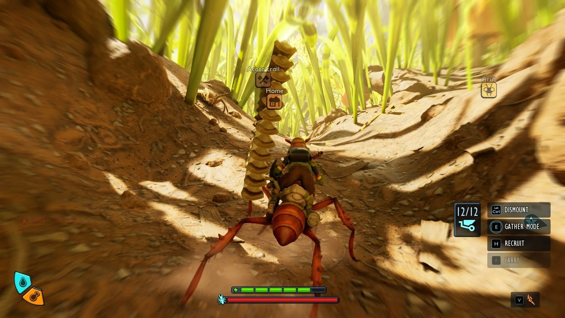 The Spider Buggy is more combat-focused, with a larger health pool and a shout ability that scares smaller enemies. Its web attacks make it especially useful against tougher encounters, and it excels at navigating web bridges, which are punishingly slow on foot. Like the Red Ant, it also expands your inventory space, letting you haul back more resources.