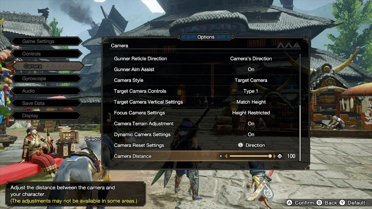First of all, open your System menu by pressing the Plus (+) button on your controller and scrolling over to the Options menu. Head on to the Camera settings and adjust the Camera Distance to a max 100. This will pull back and raise the camera in relation to your character, giving you a greater view of your surround area which is crucial when fighting all the large monsters present in the game. Of course you can set this to your liking but we do highly recommend adjusting this as soon as you can.