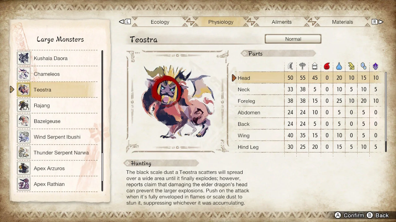 Often overlooked by many players early on are the vast amount of information stores in your Hunter's Notes. After successfully hunting a monster a monster for the first time, details about their elemental weaknesses and resistances, tolerances to status ailments, and even their drop rates are all stored here. Making it easier to know what do go for during hunts if you're looking for specific parts and knowing which build to bring.