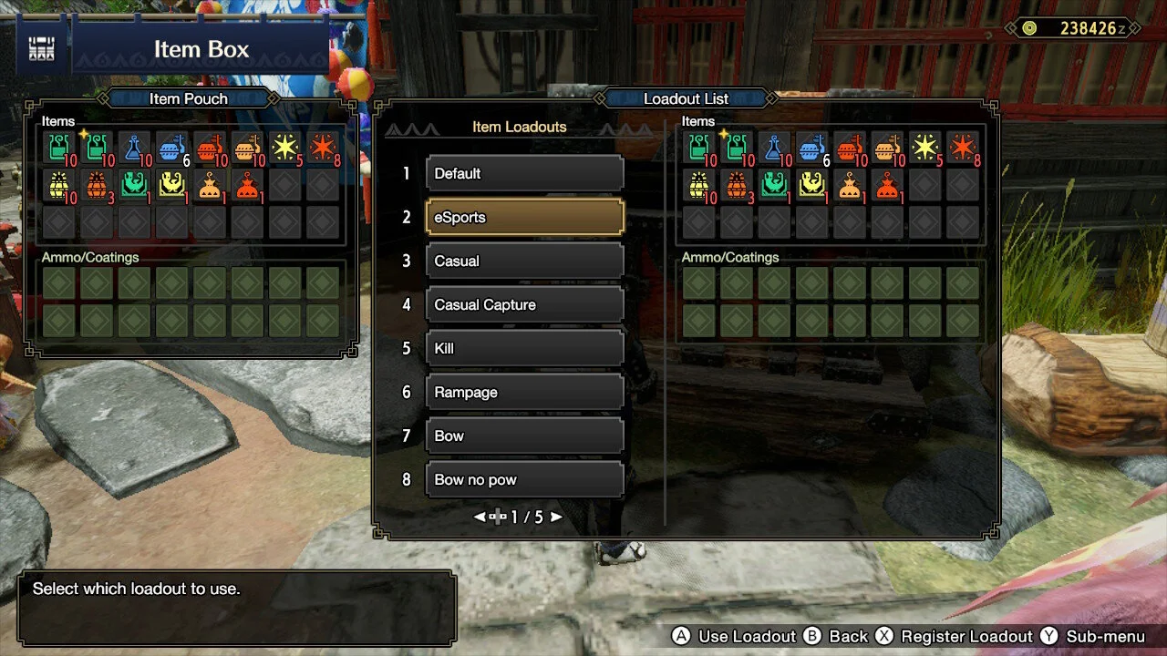 Speaking of your item box. It's best to spend time registering item loadouts for specific quest types (hunt, capture, etc) and for weapons that require specific ammo. Making loadouts will save you so much time when restocking on items before or during a quest. You can start registering equipment loadouts once you begin messing around with different weapons, armor sets, and decoration combinations. This will save you so much time as opposed to manually switching each individual armor piece out etc.
